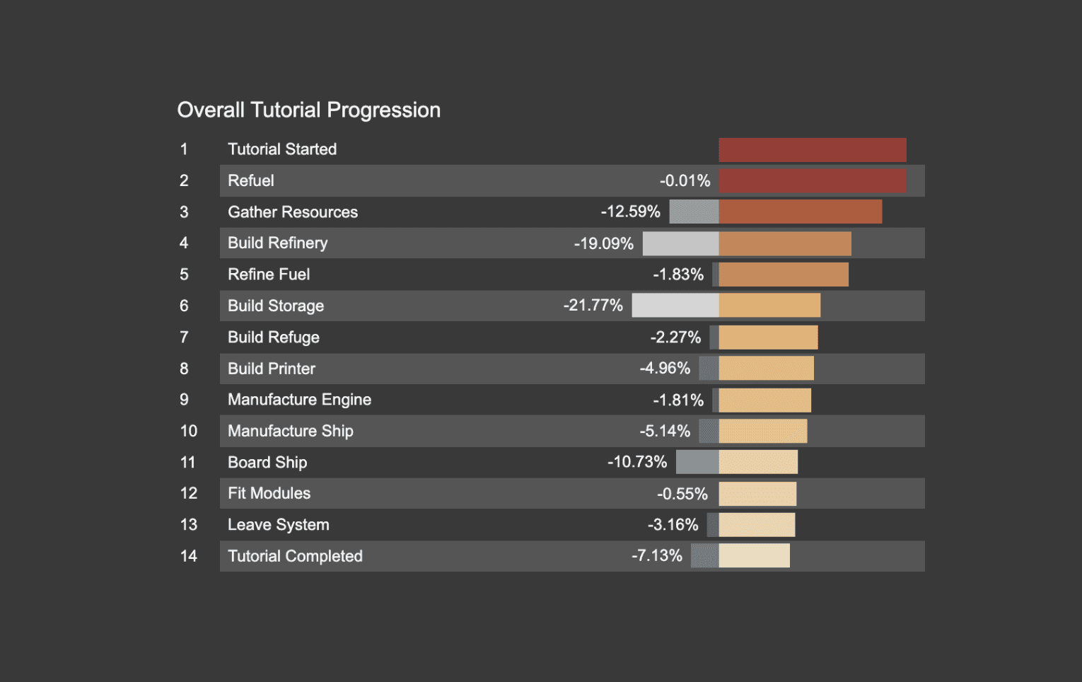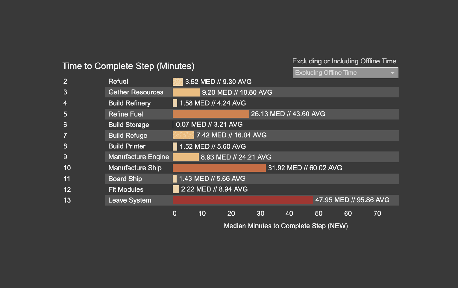 A quick explainer on this one, the % shown at each line is the % of new players that don’t complete the previous step and move onwards. For example, of all the players that start the tutorial by entering the game, only 0.01% (or 1 in every 10.000 new players) don’t move onwards to refuel their ship. Now, suddenly, that large time ‘leave system’ looks a lot more understandable as only 7.13% of all new players drop out here. We can take this to mean if you’ve reached that point, you understand the gameplay to the level where you have figured out what to do next.