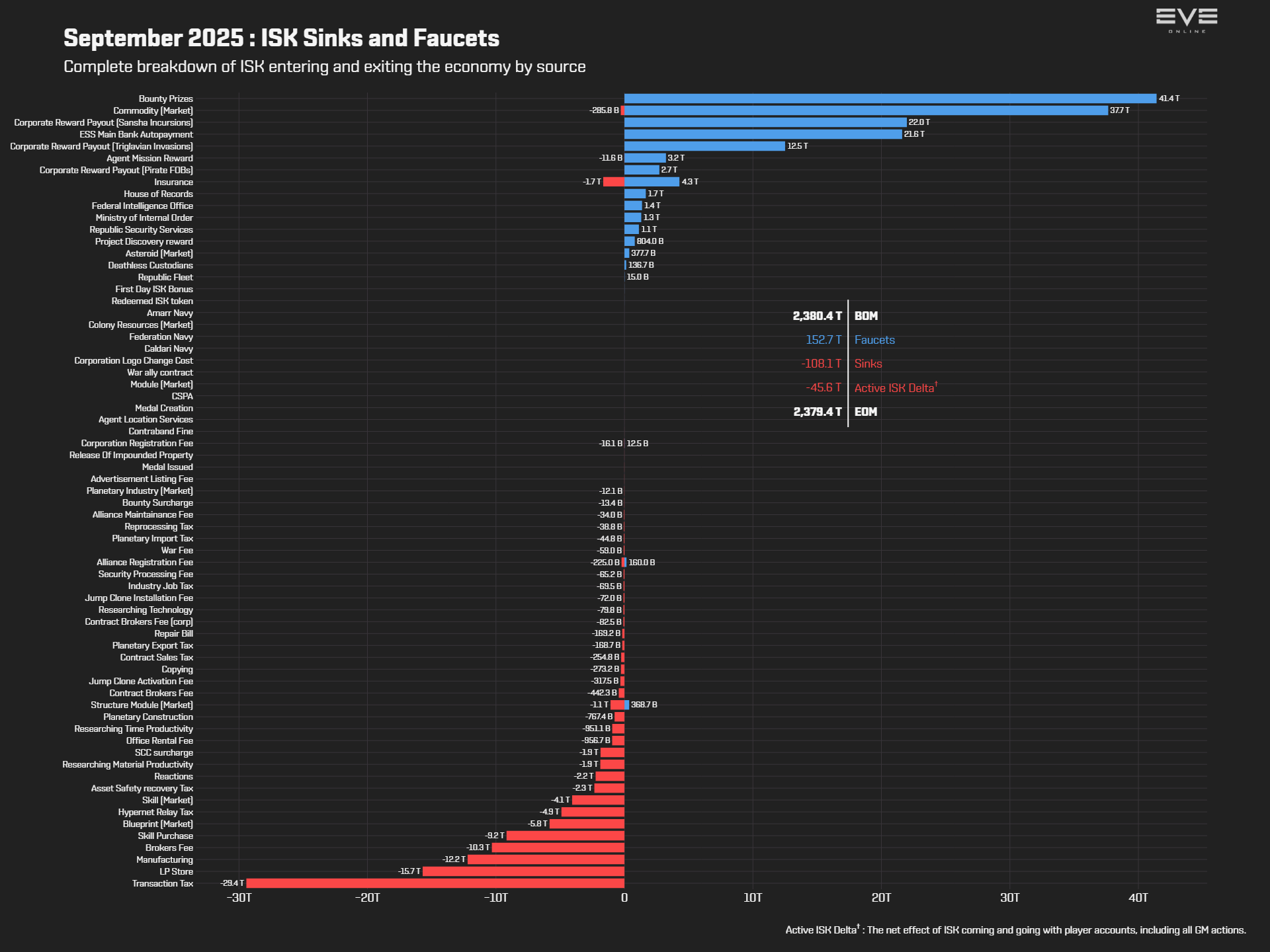 CCP Games published EVE Online's monthly economic report for September last Tuesday. I'm still trying to figure out how to approach the data since CSM member and EVE economics YouTuber The Oz informed me that ISK is still considered active until an account has not logged in for 90 days. I do wish CCP would confirm that someplace on the internet, but until proven otherwise I'll go with the guy who has direct access to the developers. With that piece of news reviewing the active ISK delta every month wasn't really productive. So what do I write about now?